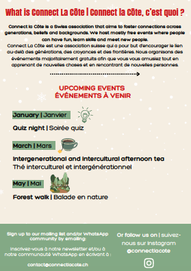 Join us for the fourth event of "Connect La Côte", a Swiss association where we aim to foster connection between people and create a sense of community across generations, faiths and backgrounds.