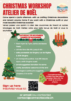Join us for the fourth event of "Connect La Côte", a Swiss association where we aim to foster connection between people and create a sense of community across generations, faiths and backgrounds. Our Christmas workshop on the afternoon of the 29th of November is the perfect opportunity to get into the Christmas spirit with some creative activities!